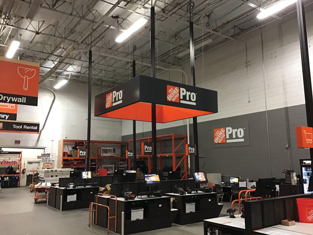 We revamped the navigation signage in the front of the store, adding highly visible color-coded lane lamps and four-sided hanging department-level signage for Garden, Customer Service, Checkout, and Pro areas along with supporting “bread crumb” signage to guide customers through each area, greatly easing some challenges that existed in the path to purchase. Until then, every store we visited had designated an employee to essentially direct customer traffic to the various checkout areas, so ultimately, we increased efficiency for both the store associates and the customers alike, while reducing clutter from legacy signage.